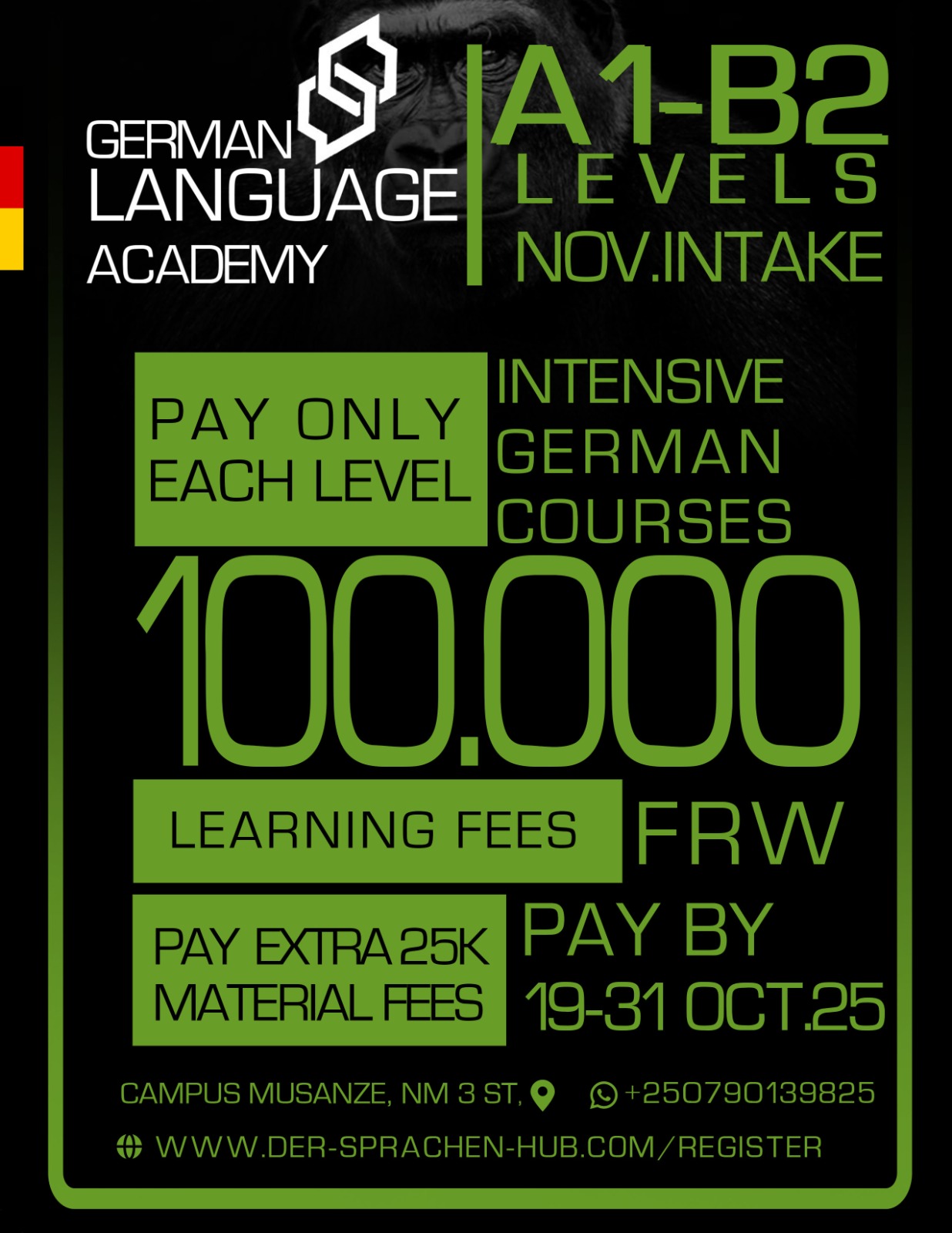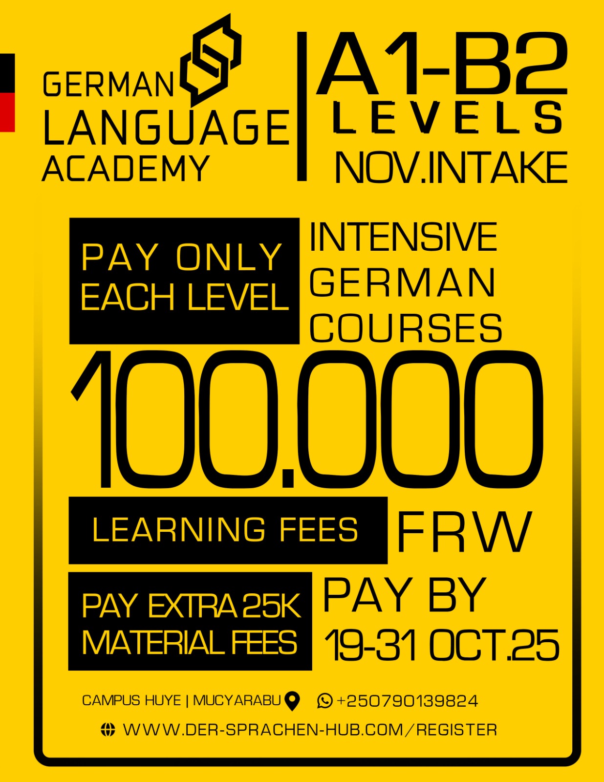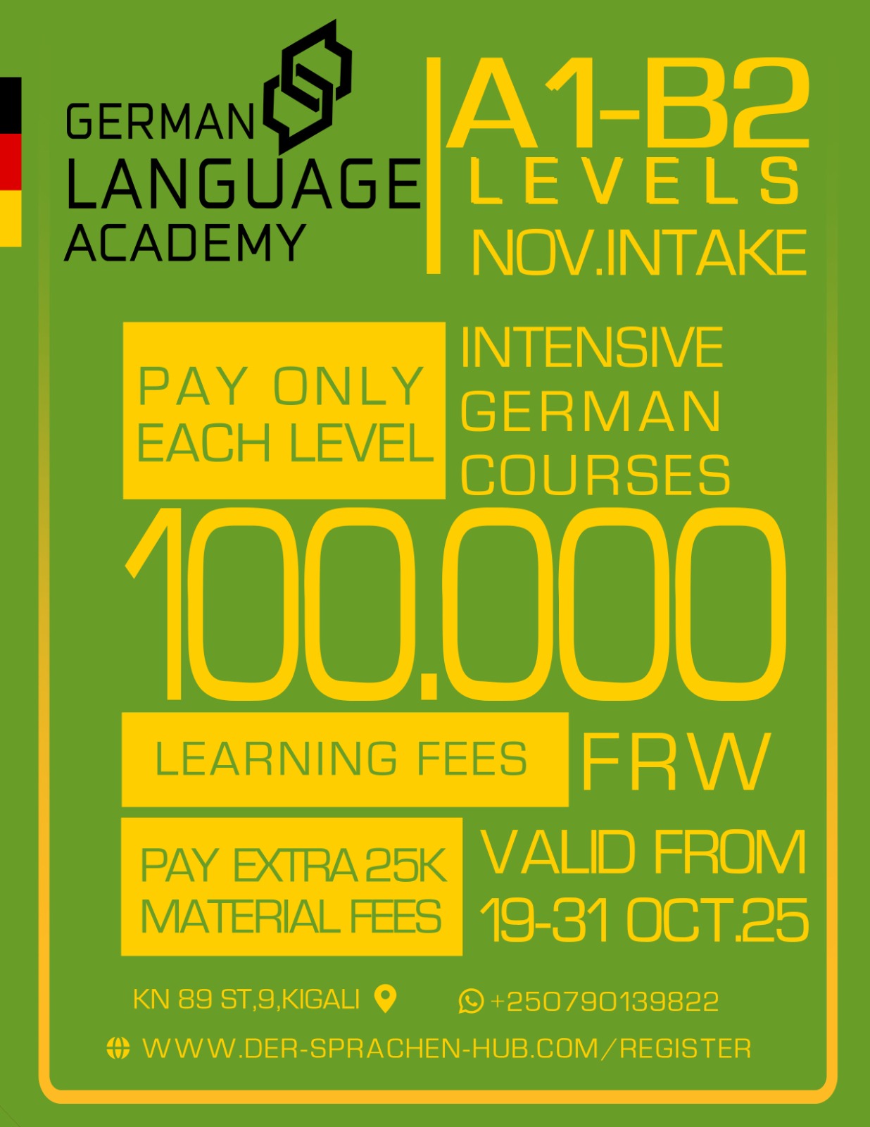 For a limited period until the end of October, one full German course level is being offered at an exceptionally low price of 100,000 RWF only, plus a 25,000 RWF fee for learning materials.
