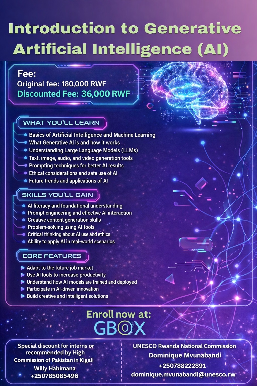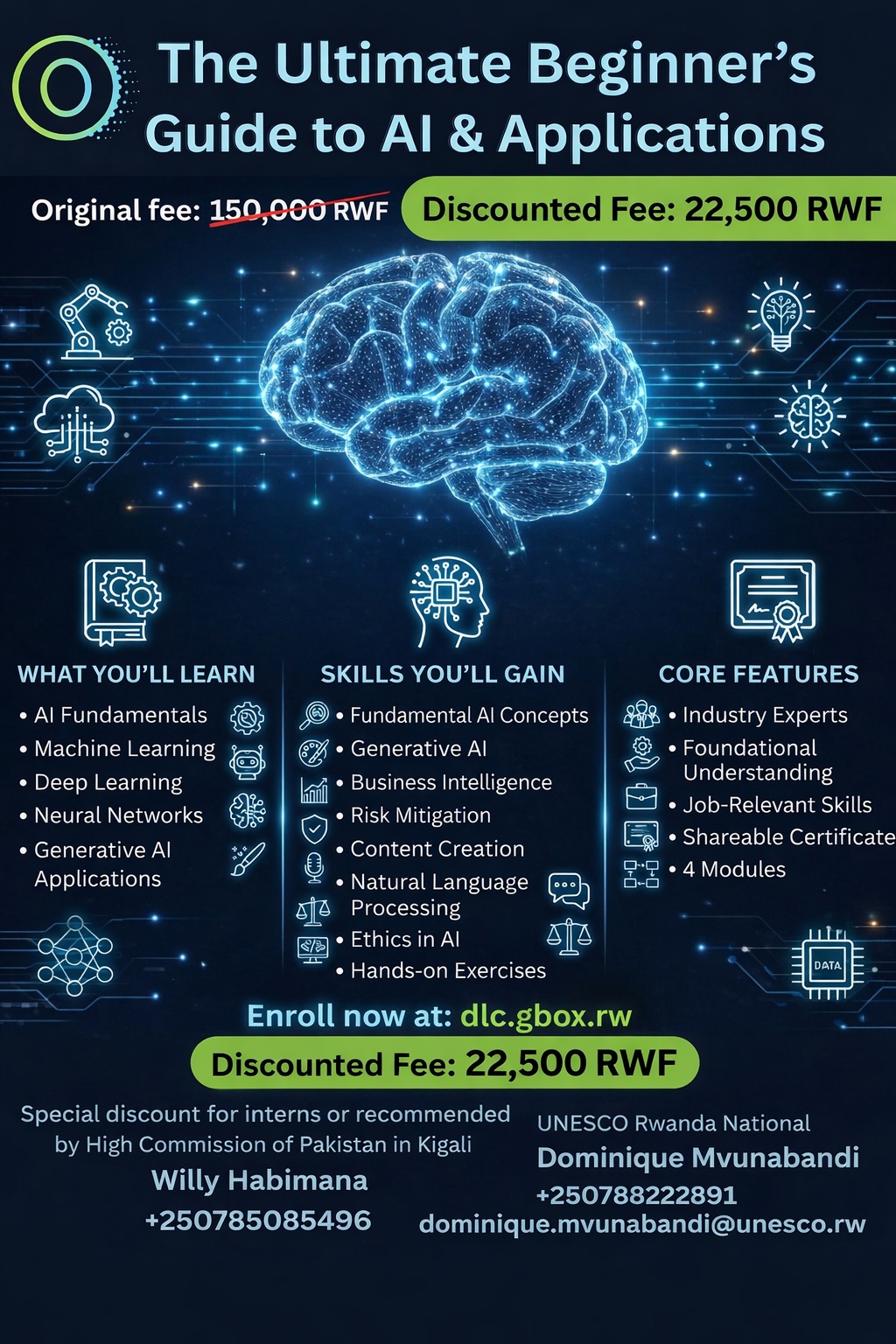 Two self-paced online courses were introduced: The Ultimate Beginner’s Guide to AI & Applications and Introduction to Generative Artificial Intelligence (AI). Both aim to give learners foundational knowledge of AI and its applications. Participants who complete the courses receive a certificate featuring the logos of the Pakistan High Commission in Kigali and UNESCO Rwanda.
