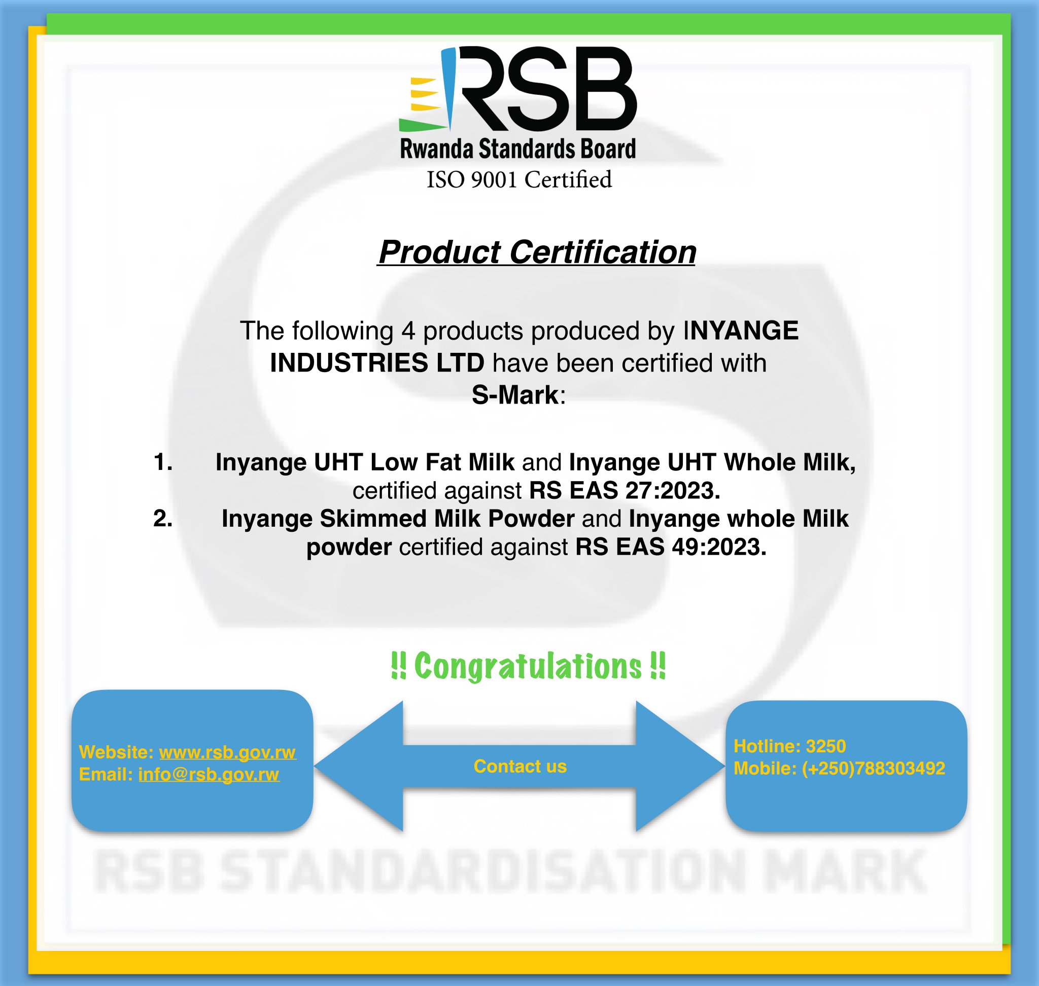 Rwanda Standards Board, RSB, via X (former twitter), has announced that it has certified 4 products produced by Inyange, including the first milk powder to be produced in Rwanda.
